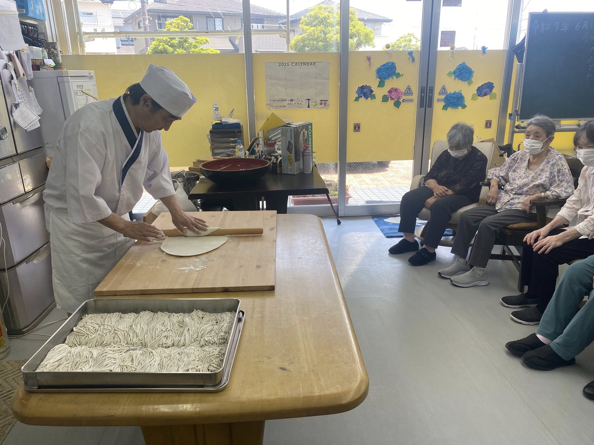 手打ち蕎麦 2か月に1回開催される「手打ち蕎麦」の日では、職人が目の前で蕎麦を打つ実演を行い、利用者様が興味津々で見学されます。一部の方には蕎麦切り体験も楽しんでいただき、新鮮な手打ち蕎麦をその場で味わえる贅沢なひとときです。季節ごとの新蕎麦や特別な風味を取り入れ、食事の楽しさと感動をお届けしています。