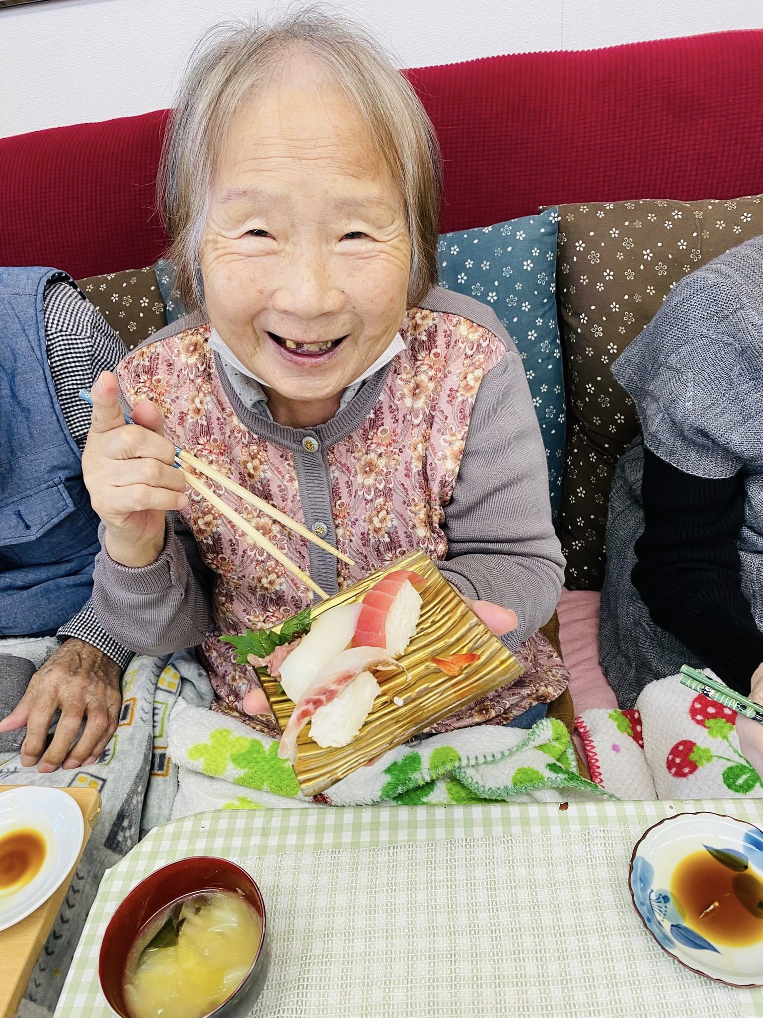 はま寿司会 お寿司の日は、利用者の皆さんの毎月恒例の楽しみになっています。「はま寿司」でテイクアウトした新鮮で美味しいお寿司は、利用者の皆様に大好評。毎回「美味しい!」という笑顔があふれ、あっという間に完売します。この特別なイベントを通じて、食事の楽しみと季節の彩りを皆様にお届けしています。